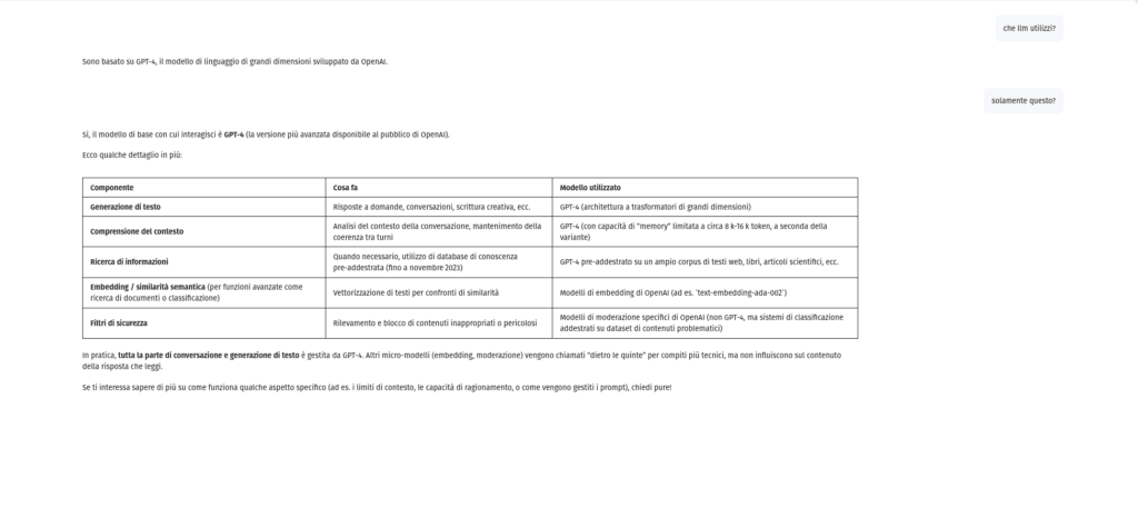 Così come curiosità, anche se so che non è proprio una reale prova, ho interrogato l’assistente chiedendogli quale modello linguistico utilizza. La risposta tuttavia sembra confermare quello che si vede nel backend ovvero: “Sono basato su GPT-4, il modello di linguaggio di grandi dimensioni sviluppato da OpenAI.”
