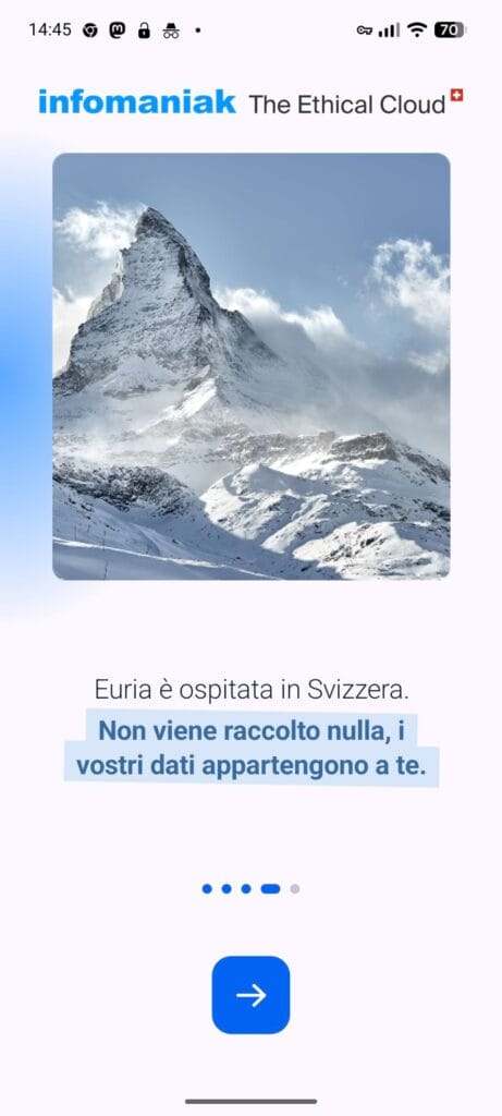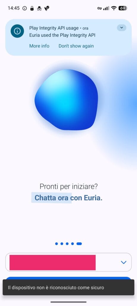 E qui arriva la nota dolente per chi utilizza sistemi operativi alternativi: Euria sembra non funzionare su sistemi operativi differenti da quello originale, nemmeno su GrapheneOS con i servizi Google installati. Provando a installarla infatti, dopo il login, ho ricevuto un errore “dispositivo non riconosciuto come sicuro” a causa del controllo Play Integrity API. Parliamo dello stesso meccanismo che mi dà lo stesso problema provando a utilizzare l’applicazione SwissTransfer, l’altro servizio di Infomaniak.