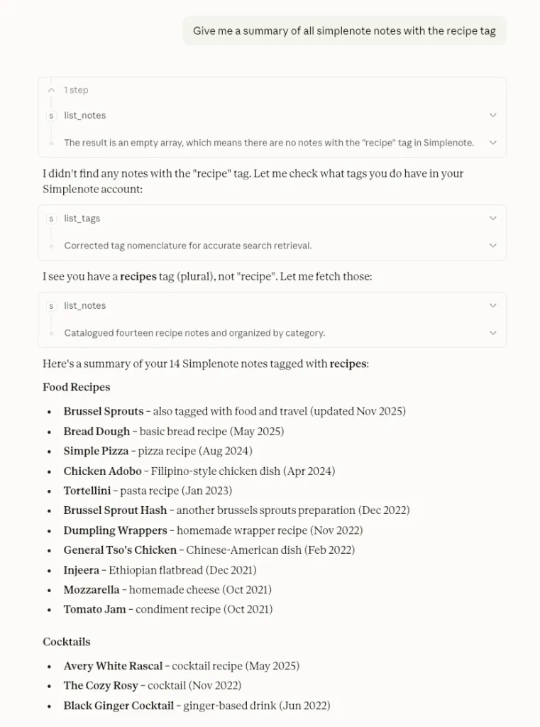 L’utilità pratica è quella di poter chiedere al modello cose come “mostrami le note con il tag ricette” o “cerca tutto quello che riguarda il progetto X”, lasciando che sintetizzi o organizzi il risultato senza aprire l’app.